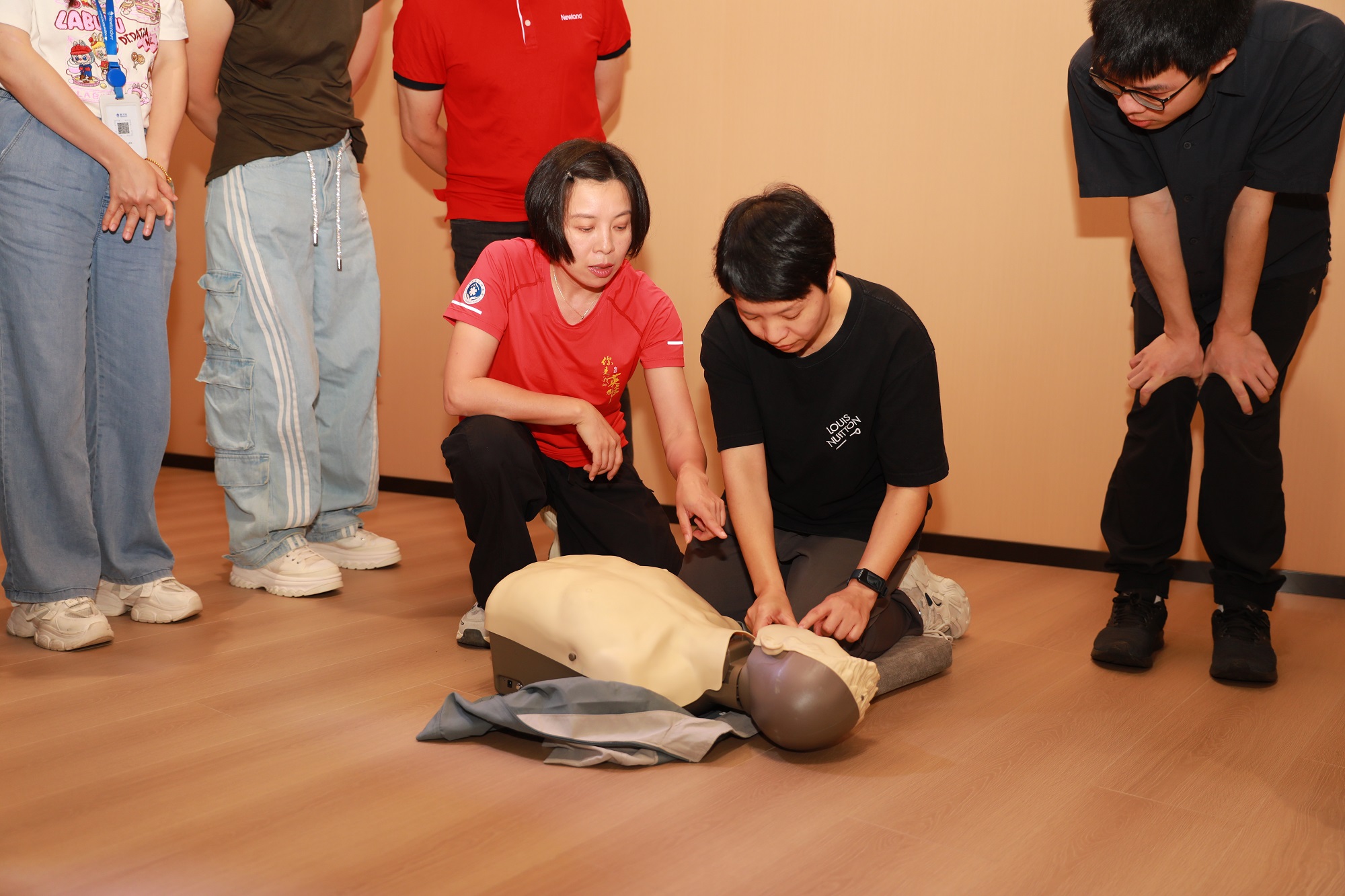 ????在實景模擬環(huán)節(jié),通信公司參訓人員逐一上前,在教練指導下利用人體模型進行實操練習,將所學知識付諸實踐。每一個按壓都在為“會用”打底,每一次模擬都在為“敢用”蓄力。